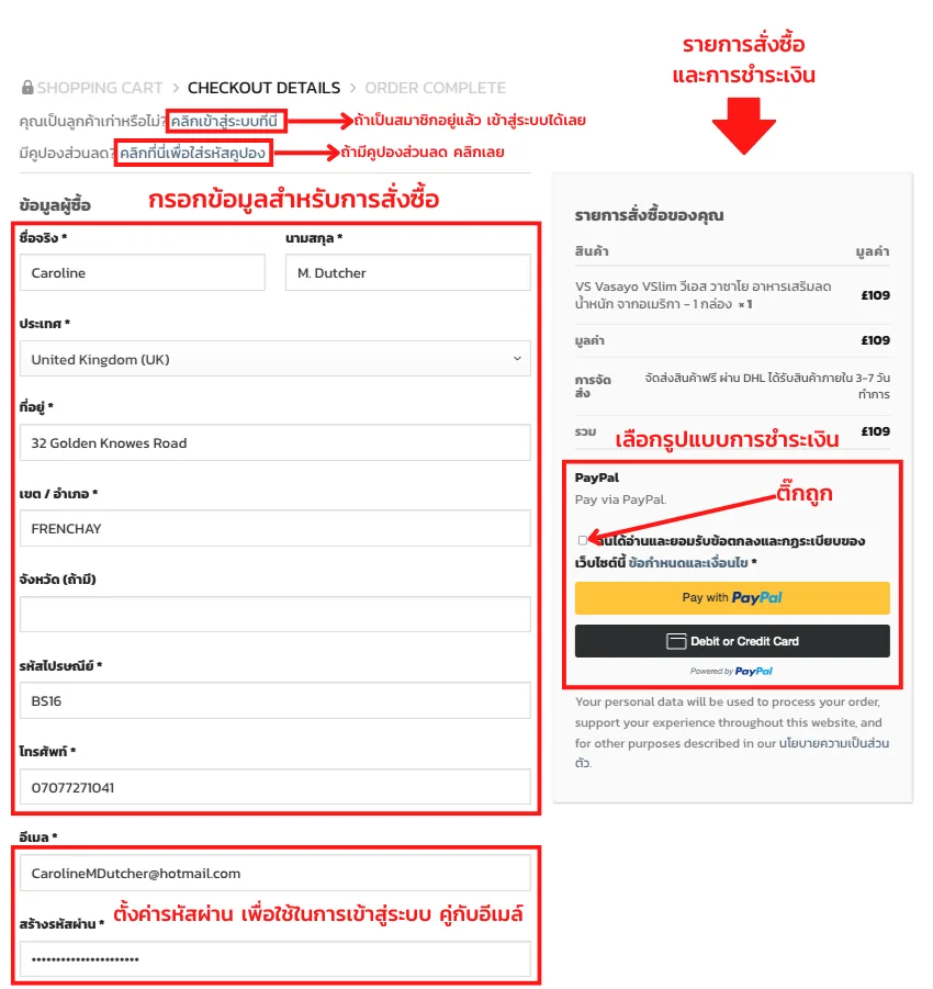 เมื่อเราเข้าสู่หน้ากรอกรายละเอียดแล้ว ในกรณีที่เราเคยสั่งซื้อ หรือเป็นสมาชิกอยู่แล้ว ให้เราคลิกเข้าสู่ระบบได้เลย หรือ ถ้ายังไม่เป็นสมาชิกก็ไม่เป็นไร ระบบจะจัดการให้อัตโนมัติ จากนั้นกรอกข้อมูลให้ครบถ้วน และ เลือกวิธีการชำระเงินให้เรียบร้อย จากนั้นตรวจสอบรายละเอียดว่า ครบถ้วนถูกต้องไหม