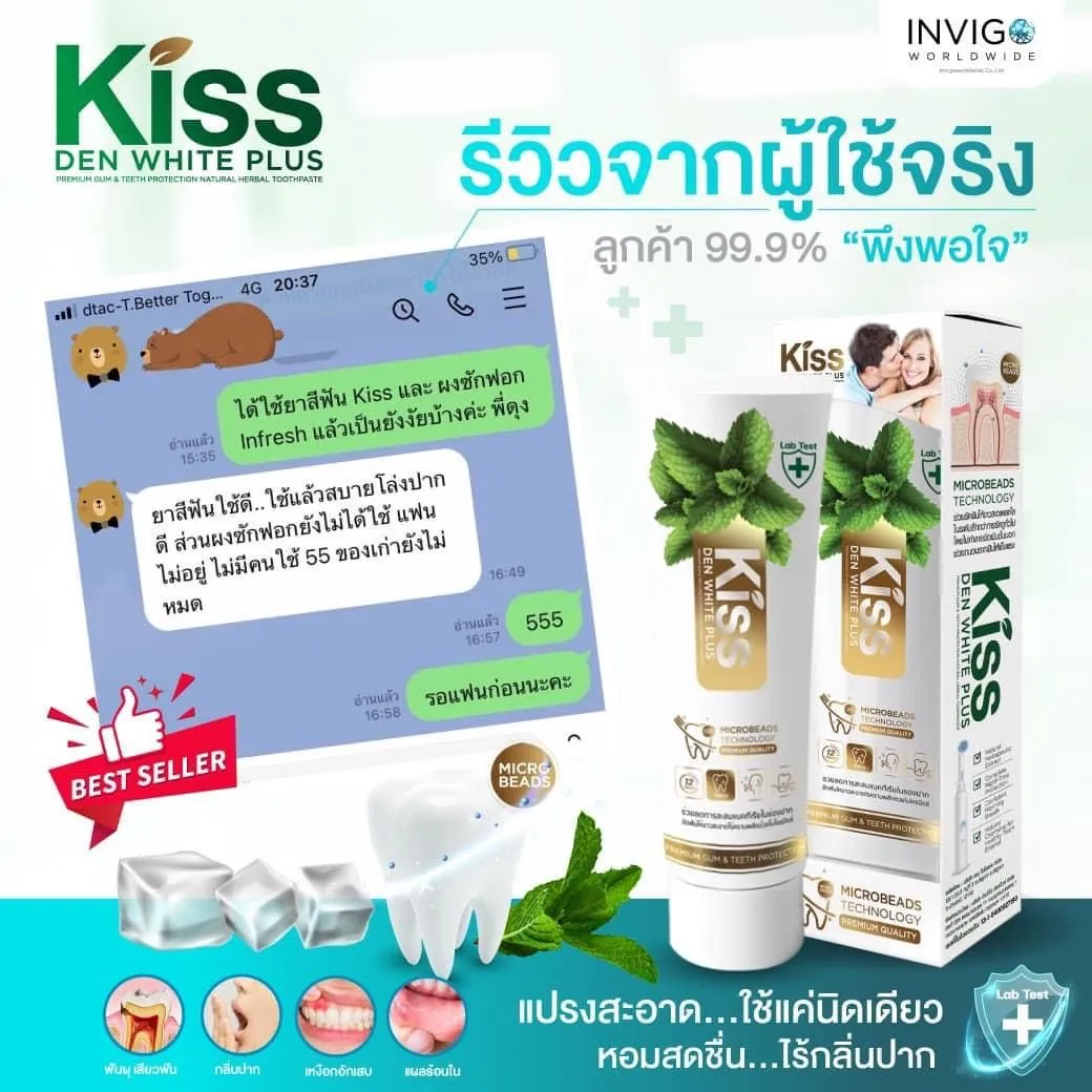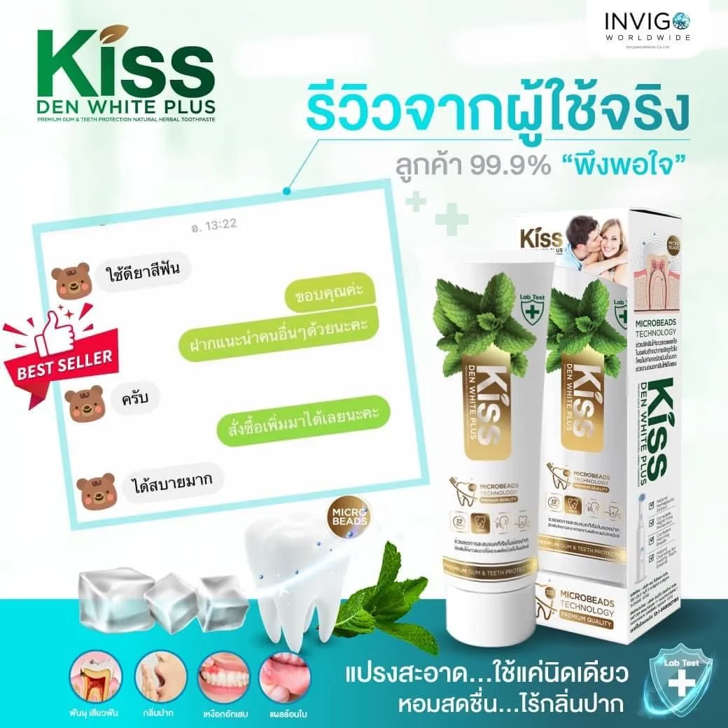 ยาสีฟัน Kiss เหมาะสำหรับคนสูบบุหรี่ ดื่มชา กาแฟ ช่วยเเก้ฟันเหลือง เเละดับกลิ่นปากได้ดี ลดคราบบุหรี่ ลดคราบชา กาเเฟ ฟันขาวสะอาด️ กลิ่นปากหอมสดชื่น️ ไม่ทำลายสารเคลือบฟัน บำรุงเหงือกให้เเข็งเเรง ขจัดหินปูน เเละเเบคทีเรียได้ดี สินค้าเกรดพรีเมี่ยม แปรงสะอาด ใช้แค่นิดเดียว หอมสดชื่น ไร้กลิ่นปาก